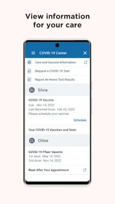 • Get timely notifications about appointments, screenings, immunizations, surgeries and procedures, pregnancy, diabetes, and more.