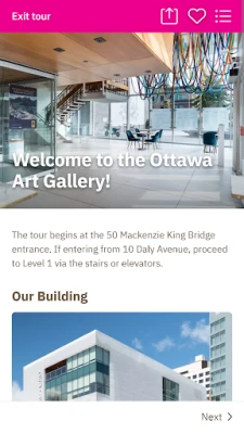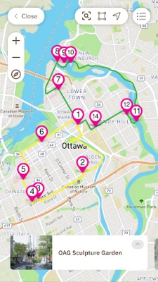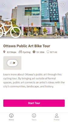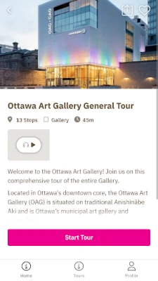 The Ottawa Art Gallery app offers curated art tours allowing you to discover the rich and diverse art scene of Ottawa. Discover the city's vibrant culture with an OAG General Tour, the Ottawa Public Art Bike Tour, or the Arts Corridor Walking Tour, all at your own pace. Whether you're an art enthusiast or a casual visitor, this app provides detailed information about the Ottawa Art Gallery and the local art scene in Ottawa, making your visit informative and enjoyable. Immerse yourself in the creativity and beauty that Ottawa's a