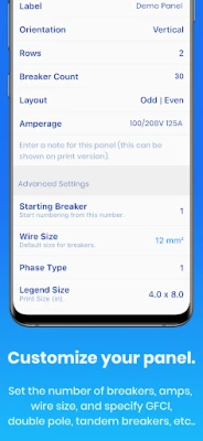 This app has all the options for creating the perfect panel legend for any panel out there. You will find the option to label phases with color, tandem breakers and 3 pole breakers. There are also options to print the legend in the exact size you need to fit a sleeve or to tape inside the door.