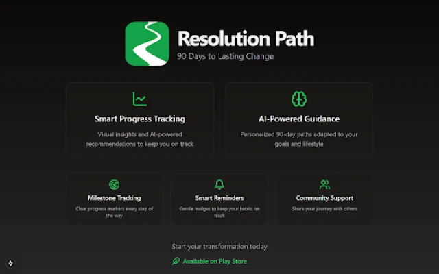 Resolution Path is your intelligent companion for turning goals into lasting habits. Using advanced AI technology, we create personalized 90-day paths that guide you step by step toward your goals.