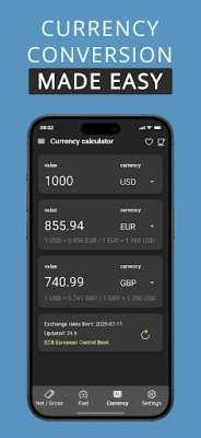 * Combines five essential tools: take-home pay calculator, net income calculator, fuel consumption calculator, EV consumption calculator, and multi-currency converter.